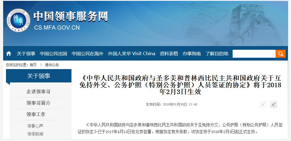 据中国领事服务网消息,《中华人民共和国政府与圣多美和普林西比民主共和国政府关于互免持外交、公务护照(特别公务护照)人员签证的协定》已于2017年4月12日在北京签署。根据协定有关条款,该协定将于2018年2月3日起正式生效。